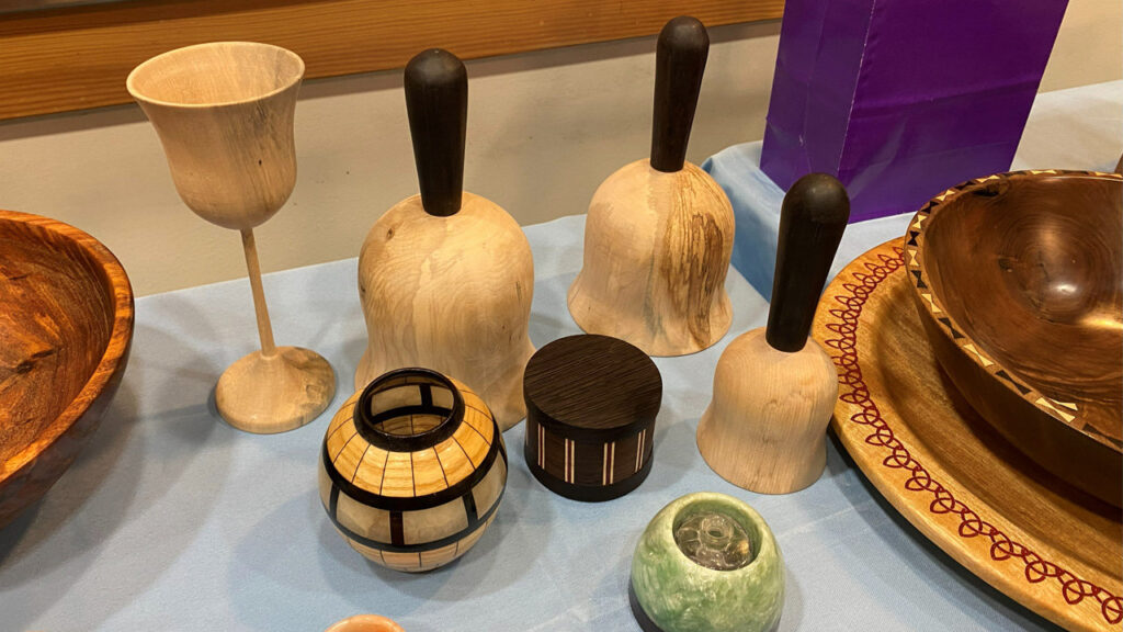Dave Vannier wanted to make some bells. The first one looked more like a goblet, so he made it into a goblet. He didn’t like the handle on the second bell. The handle of the third bell fits his wife’s hand.