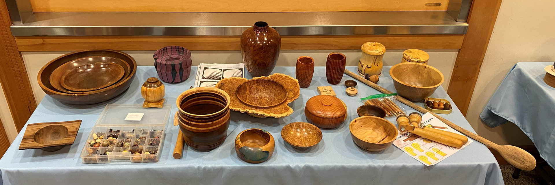 A table with dozens of woodturning projects, mostly bowls, platters, and vessels.